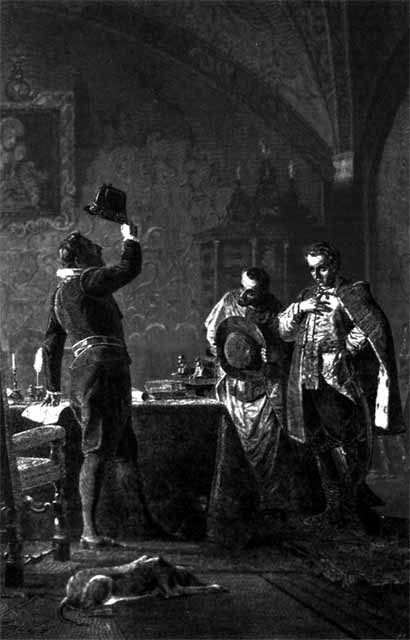 Король Сигизмунд признает Лжедмитрия царевичем. Гравюра с картины И. В. Неврева.