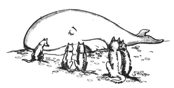 Расселись на берегу вокруг кита, морды кверху задрали.