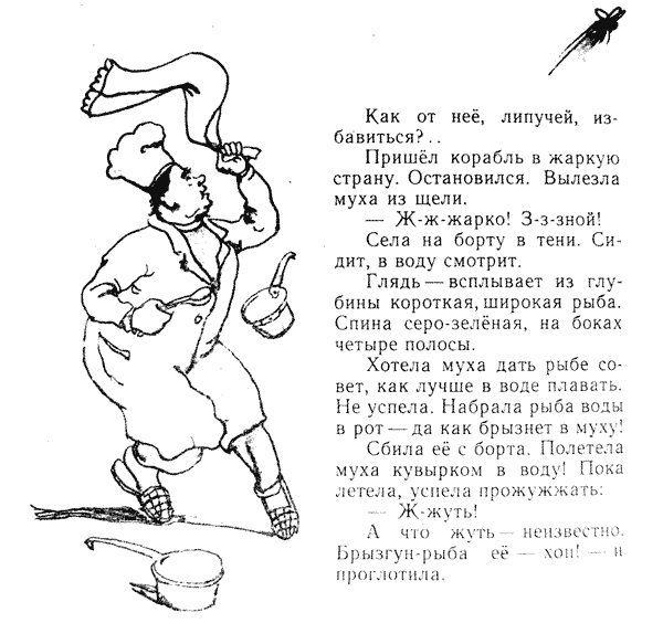 Залетела муха на корабельную кухню — камбуз. Там повар — кок, весь в белом, — компот варит.