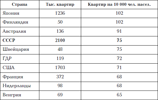 Вот как обстояли дела в мире и в СССР за пять лет до смерти СССР с жилищным, например, строительством. Таблица 1 показывает, сколько квартир было построено в 1986 году в первой десятке стран мира.