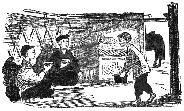 Так мы просидели с полчаса, болтая о пустяках. Между тем хозяева юрты не возвращались. Конопатый все это время, как истукан, стоял у двери.