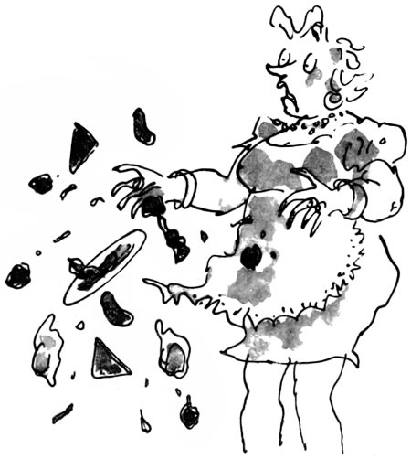 В тот момент, когда отец заходил с другой стороны стола, чтобы усесться во главе его, из кухни примчалась мать с огромной тарелкой, доверху наполненной яйцами, сосисками, беконом и помидорами. Увидев своего мужа, она издала крик, вместе с которым, казалось, и сама едва не взлетела в воздух. Тарелка грохнулась на пол, а ее содержимое разлетелось в разные стороны. Все вздрогнули, включая мистера Вормвуда.