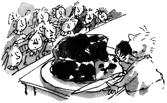 А между тем в выражении лиц наблюдавших за ним двухсот пятидесяти детей происходила едва заметная перемена. Когда все только начиналось, у них был такой вид, будто они предчувствовали неладное. Они приготовились стать свидетелями неприятной сцены, когда мальчик, набитый по горло шоколадным тортом, вынужден будет сдаться и молить о пощаде и им придется следить за тем, как торжествующая Транчбуль будет заталкивать куски торта в широко раскрытый рот задыхающегося ребенка.