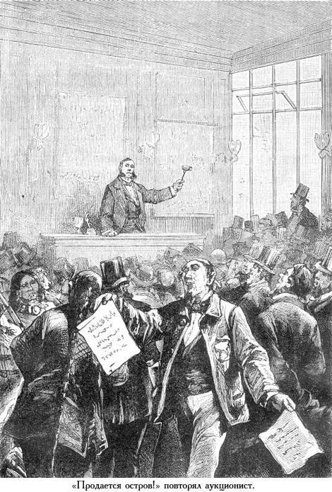 — Продается остров! Продается остров! — громко вторил его помощник Джинграс, расхаживая взад и вперед по битком набитому залу.