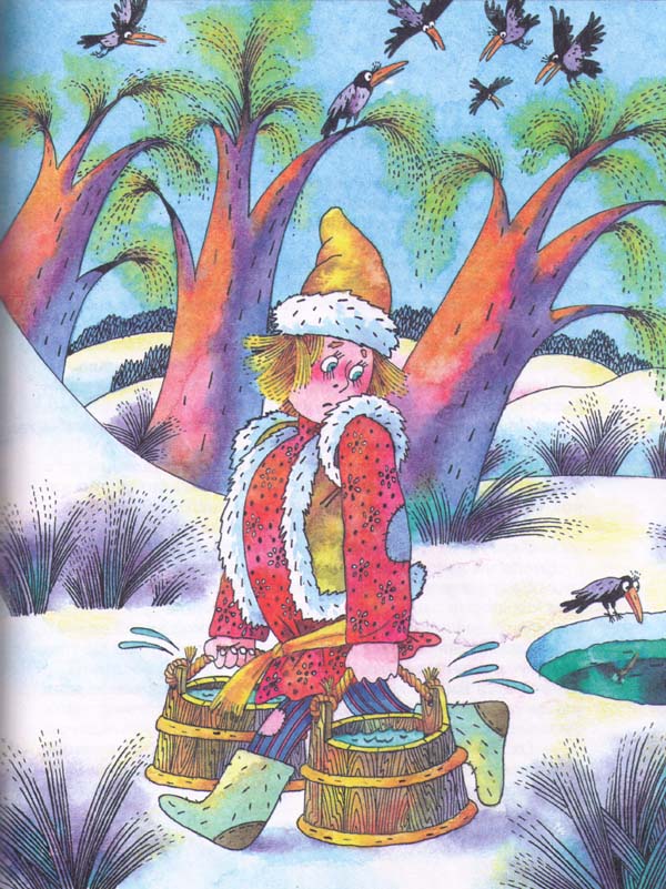 Пришлось Емеле самому снова за ними к проруби шагать, самому снова воду набирать и с полными бадьями самому домой возвращаться. ( Потому что он больше со щучьим веленьем экспериментировать не хотел. Он его побаиваться стал.)