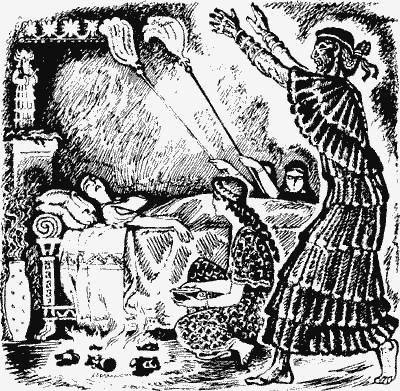 Две ночи и целый долгий день она терпела боли, прежде чем пришли лекари и заклинатели. В ту ночь, когда ей стало плохо, когда затуманилась голова и все тело словно плакало, был седьмой день месяца. Все люди Ура знали, что 7, 14, 19, 21, 28 дни месяца несчастливые, и лекарь не имеет права лечить больных в эти дни. Жрица терпела до рассвета восьмого дня, когда можно было позвать царского лекаря. Царский лекарь Урсин тотчас же прислал к больной своих заклинателей. Они принесли деревянные фигурки демона Ахазу и стали их сжигать у постели Нин-дады. Вокруг ложа жрицы стлался синий дым. Больная задыхалась, кашляла и обливалась слезами. Однако лекарь не услышал жалоб и стонов. Жрица верила в чудодейственную силу колдовства.