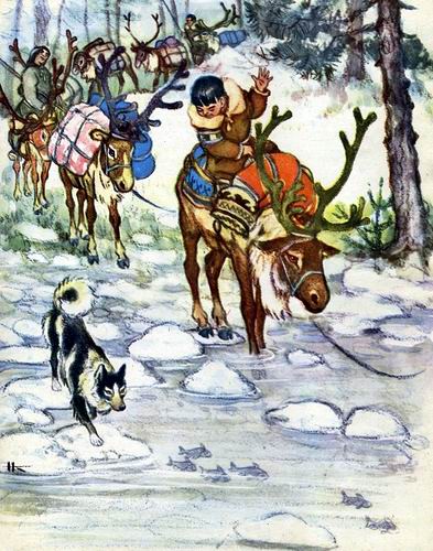 Олени идут по каменистым россыпям, и Ваня больше никого не видит. Ему делается скучно. Он с завистью смотрит на Аркакана — свою любимую собаку — и готов заплакать. Как хорошо было бы сейчас побегать с ним и поиграть!