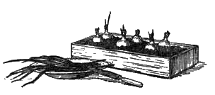 Вера Ивановна принесла ящики с землёй, выкопала ложкой ямку и посадила в неё луковицу: тупым концом, из которого корешки вырастут, — вниз, а острым, из которого будут расти зелёные стрелки, — вверх.