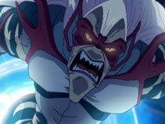 Кожа, с которой уже спадал зеленый оттенок, снова приобрела прежний окрас. На зеленой коже рук начали появлятся чешуйки. На животе образовался пластинчатый панцирь желтого цвета. Штаны срослись с ногами, которые образовывали хвост. Волосы приобрели молочный окрас и удлинившись, опустились назад, а на глазах образовалась красная маска, идущая от уха до уха, которые тоже изменились. Они стали вытянутыми, словно эльфийские.