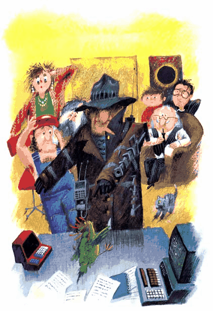 Притихшие микроши следили за происходящим с большим интересом. Инспектор задавал вопрос за вопросом, а Попугай так путано рассказывал о появлении Кадабры, что очень скоро совершенно сбил всех с толку. В конце — допроса Тестик даже стал немного заикаться, а Попугай расходился всё больше и больше. Он махал крыльями, запрыгивал на шкаф, грозно топал ногами, изо всех сил пытаясь поточнее описать Кадабру. Запутав всех вконец, он схватил световое перо и с криками: «Ручищи у него во-о-о!.. Ножищи у него во-о-о!..» — бросился рисовать портрет.