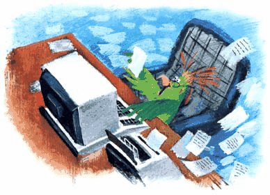 Оглядевшись по сторонам и увидев, что в комнате никого нет, Попугай издал радостный вопль и кинулся к столу. Он быстренько засунул дискету с портретом Кадабры в дисковод и принялся стучать по клавишам. Попугай стучал и всё время приговаривал: