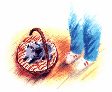 Посреди Алёшиной комнаты стояла корзинка, а из неё высовывал мордочку маленький серый котёнок. Алёша бережно взял его на руки, погладил и спросил папу: