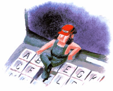 И действительно, свесив ножки, на клавиатуре компьютера сидел маленький человечек и улыбался. Незнакомец был одет в опрятный голубой комбинезончик с надписью «ТОЧКА». На голове у него красовалась лихая шапочка с длинным козырьком.