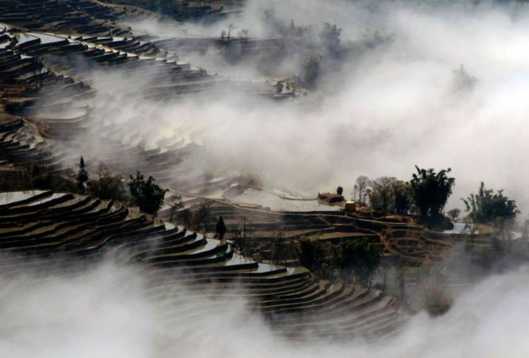 Террасы рисовых полей, залитых водой, в которых копошатся раздетые крестьяне. Поля были разделены напополам дорогой, которая упиралась в ворота замка. По дороге скачет отряд человек 40 на лошадях. За каждым всадником закреплен прямоугольный флажок фиолетового цвета. Реконструкторы, наверное. Просто японцы выехали на природу пожить жизнью предков. Да, именно, очень натуральная реконструкция под старину.