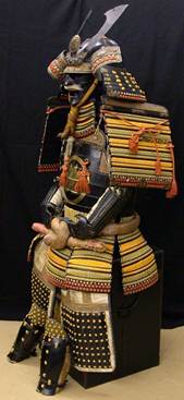 Я вернулся на свое место, и только сейчас заметил у торцевой стены небольшой помост, на котором лежало несколько подушек, и стояло какое-то чучело. Приглядевшись, я понял, что это не чучело, а средневековые доспехи. Шлем с рогами, наплечниками и демонической личиной, панцирь, наручи, поножи, что-то вроде бронированной юбки. В середине панциря искусно выгравирован круг с двумя параллельными прямыми внутри. Рядом с доспехами, на специальной подставке лежали два меча. Длинный, сантиметров 90, в черных, украшенных серебром ножнах — классический японский катана. Маленький, сантиметров 40 — вакидзаси.