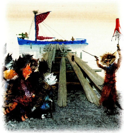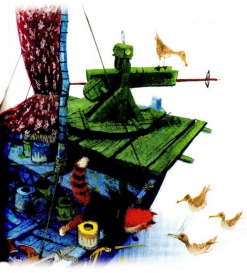 Целую неделю коты занимались подготовкой к плаванию. Лодку подремонтировали, просмолили и покрасили.