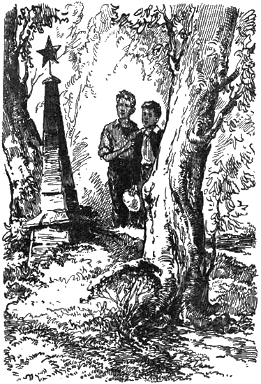 Пройдя шагов двадцать, Костя обнаружил, что в одном месте трава и кусты возле тропинки примяты. Раздвинув кусты, он, а вслед за ним Слава вышли на небольшую прогалину. Она была обсажена высокими серебристыми тополями, похожими на старых солдат, и между двух самых старых, самых высоких тополей, вытянувшихся словно на карауле, поднимался холмик, на нем — деревянный, потемневший от времени обелиск со звездой, а у подножия обелиска — свежие, вероятно сегодня принесенные, цветы, еще издающие слабый, нежный аромат.
