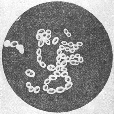 Другим способом заражения является перенос возбудителя в дыхательные пути через окружающий нас воздух. Возбудители многих заразных болезней выделяются больным организмом из поражённых дыхательных путей (нос, глотка, бронхи, лёгкие). Когда больной человек говорит, кашляет, чихает, он выбрасывает в окружающий воздух мельчайшие брызги — капельки заражённой мокроты или носовой слизи (рис. 30). Таким путём микробы-возбудители легко проникают вместе с заражённым воздухом в нос, глотку, в лёгкие здоровых людей, где и происходит дальнейшее развитие болезни. Такой «воздушный» или «капельный» путь движения заразных микробов наблюдается при заражении здоровых людей гриппом, скарлатиной, корью, дифтерией, коклюшем, оспой, свинкой.