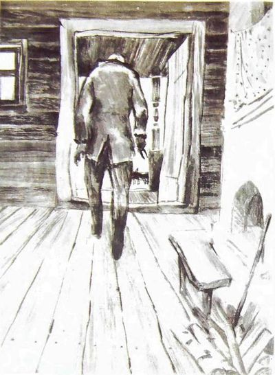Зашили последний узел бабы. Сами оделись. Разоренную избу оглядели. И Степан снова поглядел на дверь, на цветочки голубые. Дверь эту навешивал — думал: его стариком древним скрозь ее ногами наперед вынесут, а вот — сам выходит прочь… Живой вроде.