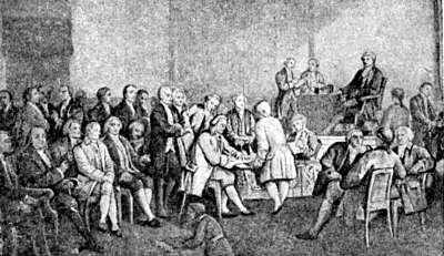Подписание Декларации независимости США. 1776 г. (С картины Трэмбелла.)