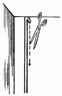 Для наклеивания обоев за вертикально расположенными трубами парового отопления полотнища обоев (после проведения необходимых измерений) нужно разрезать по вертикали, чтобы линия шва приходилась на участок стены позади трубы и была незаметной (рис. 12).