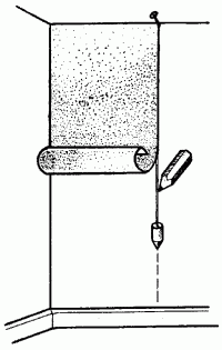 Процесс наклеивания обоев происходит в следующем порядке: взяв сложенное полотнище за края, отгибают его верхнюю часть и прикладывают к верхней горизонтали того угла стены, от которого предполагается начать оклеивание. С помощью отвеса определяют строго вертикальную линию, по которой должно быть выровнено первое полотнище (рис. 7). Если стены в помещении недостаточно ровные, желательно наметить эту вертикальную черту карандашом, проведя им вдоль линии отвеса.