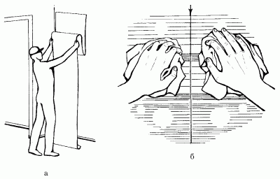 Рис. 8. Наклеивание обоев: а – прикладывание обойного полотнища; б – разглаживание.