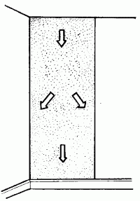 После того как к стене будет прикреплена верхняя часть полотнища, нужно аккуратно провести по поверхности обоев мягкой хлопчатобумажной салфеткой до линии сгиба полотнища. Затем, отогнув нижнюю половину полотна, следует так же провести салфеткой по вертикали, выравнивая обои до самого плинтуса и не забывая сразу же разглаживать морщины и вздутия, появляющиеся в процессе работы (рис. 8).