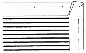 2. Скалывают обе полоски лицевой стороной внутрь и стачивают (рис. 44, а) на расстоянии 1,5 см от края по всей длине. Отворачивают и проглаживают деталь, ширина которой составляет 12 см. Приутюживают и прокладывают наметку или ряд булавок, чтобы получился ровный кант шириной 1,5 см.