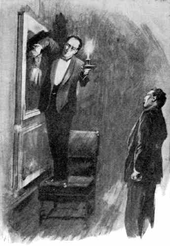 Он встал на стул и, держа свечку в левой руке, прикрыл согнутой правой широкополую шляпу и длинные локоны.
