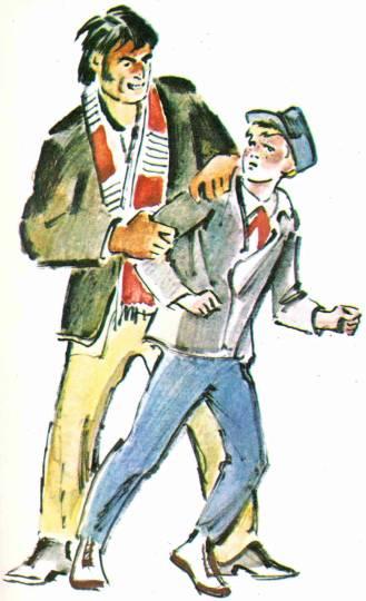 Дядя Саша хмыкнул и уткнулся в книгу, а я пошел домой и почти сразу лег. Подумать было над чем. И я стал вспоминать этот день. И, во-первых, вспомнил те сорок пять минут: от 17.15 до 18.00. А было вот что. После того как мы расстались с батей, я сразу побежал домой. Бежал, бежал, а на углу Моховой и Белинского растянулся на тротуаре. Какой-то тип подставил мне ногу, и я шлепнулся носом вперед. Правда, удачно шлепнулся — носа не расквасил. Вскочил злой, как черт. Смотрю: стоит здоровенный парень, черный, как цыган, и смеется. И зубы у него, как у нашего Повидлы — белые-белые и мелкие; мне даже показалось, что у него и клыки собачьи есть. Глаза у него маленькие, как бусины, и темные-темные, так что кажется, их вовсе и нет, а просто черные дырки вместо глаз. Мне стало почему-то страшновато. А он смеяться перестал, и рожа у него стала странная, словно ее перекосило на одну сторону. Он взял меня за плечо, прямо как будто клещами вцепился, и сказал: