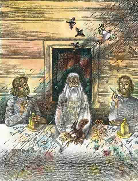 На третье-то лето в погожий день захотелось Савелию повеселиться. Сели они за дубовый стол, в кленовые ковши резные меду налили — не больно богатый, но веселый пир затеяли. Палею и Люлеху — равная мера. Угостились да под нарядные наличники высыпали. Старший-то сын Савелия — со свирелью на пенек, а другой сын гусли на колени положил да давай подыгрывать.
