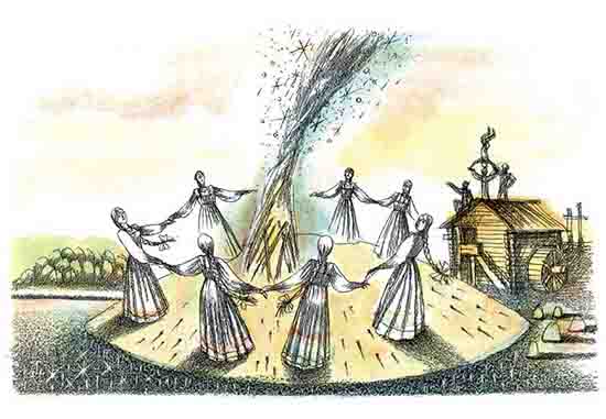 Небось слыхали, как в прежние времена день духов праздновали. В тот день под вечер только старики да малые детишки дома оставались, а все, у кого хоть искорка в сердце осталась, спешили в бор сосновый к озерцу, к дальней мельнице. Костры там пылали, летели от костров в небо искры, смешивались те искры с звездами яркими и было еще светлее у озерца. Девки статные да красивые хороводы водили, парни через костры прыгали, а там, где более всего народ толпился, — пляс удалой шел. А где плясуны, там и Гошка Дубов — мастеровой с фабрики хрустальной. Коль Гошка входил в круг, то и девки свои хороводы бросали: посмотреть было на что. Бывало, пойдет с перекатами, с перехватами, рук и ног не видать. Пляшет и в этот раз Гошка, а сам по сторонам поглядывает: какую бы девку в круг вызвать? — думает. Смотрит, стоит девица, не видал ее раньше мастеровой. И подумать Гошка не успел, приглашать ее в круг аль нет, а ноги уж сами поднесли парня к девке. А она стоит, глаза опустила, платок в рученьках теребит. Так, может, и стояла бы, да вытолкнули ее в середину круга. И ожила тогда дева. Взмахнула платком, вскинула голову, уколола Гошку взглядом и пошла по кругу, будто лебедь-птица. Тихо идет, плавно, а Гошка вкруг нее кочетом ходит. Фабричные кричат: