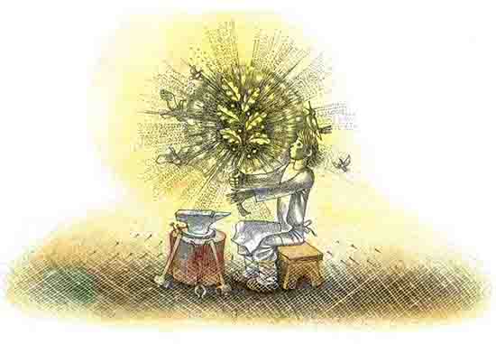 Только подумал так Ефим — и весь узор морозный вспомнил. Вытащил из окошка зипун и бегом на шлифовню. Выбрал вазу покрупнее, колесо шлифовальное поострее заточил и за работу взялся. Другие мастера заприметили, что Гуляев лихорадит что-то, стали приставать с расспросами, а он и не слышит будто. Уперся лбом в вазу, уцепился руками за края и режет без устали. У другого, наверное, руки от такой работы отвалились бы. А он хоть бы что! Начал вазу утром, а кончил уж при лучинах. Отдал на щетки полировальные, а как отполировали, смотреть на вазу все мастеровые сбежались. Начались тут ахи да охи. Вазы такой никто еще не видывал. А Ефим присел прямо на пол, прислонился к столбуху и заснул как убитый. Утром проснулся от голоса мальцовского: