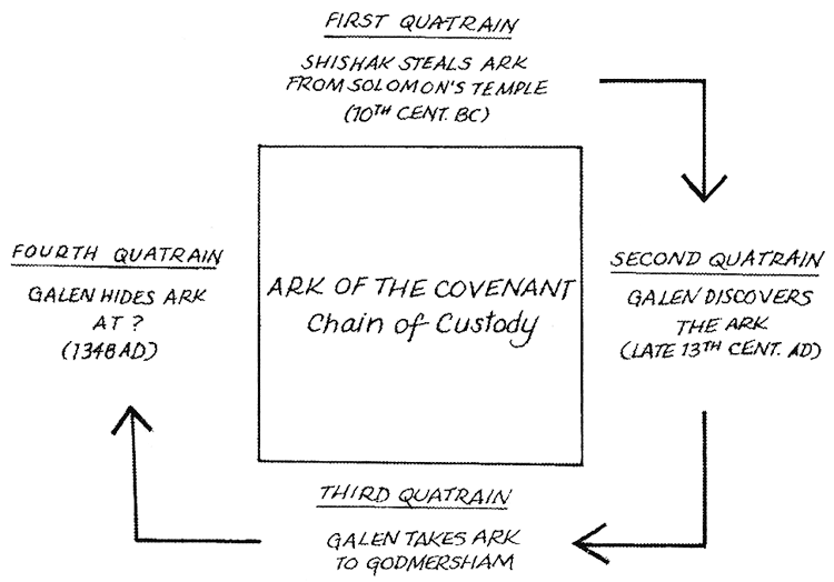 — Знаешь, ты был абсолютно прав. Гален действительноиспользовал свои четыре катрена в качестве поэтической криптограммы, зашифровав последнее местонахождение Ковчега в строчках четвертого четверостишия.
