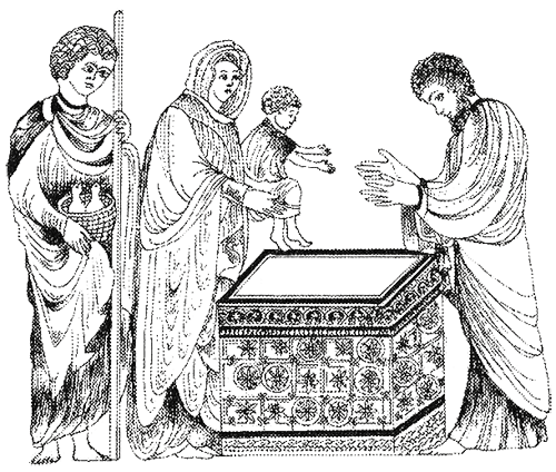 Кэдмон кивнул, убежденный в том, что это именно тот самый витраж, на который указывала Филиппа. Сцена — Сретение — изображала известный рассказ из Нового Завета о том, как Мария и Иосиф представляют младенца Иисуса первосвященнику иерусалимского храма. Его внимание было приковано к двум безобидным с виду деталям мозаики: корзине в руках Иосифа с двумя гусятами и Ковчегу Завета, над которым держала младенца Иисуса Мария.