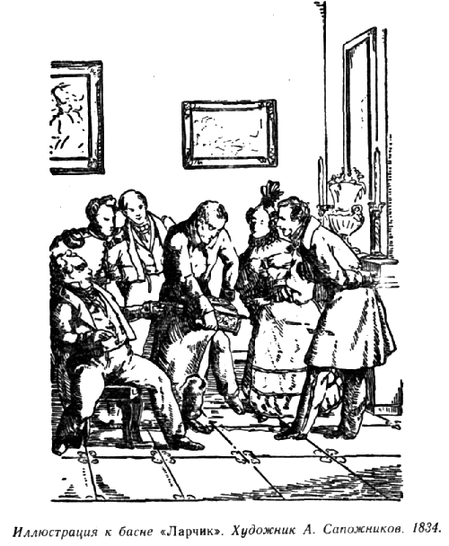 Вокруг Крылова были люди, во многом ему чуждые, привыкшие к довольству и роскоши. Они неустанно хлопотали о приумножении богатств, о повышении в чине, о милостях знатного вельможи. Каждый стремился занять место ступенькой повыше, обеспечить свое благополучие за счет других. Ему ничего этого не надо. За годы скитаний, лишений, бездомного существования он хорошо узнал превратности судьбы, эфемерность славы, тщетность поисков справедливости. Его уже не манила опасность борьбы. Так мореплаватель после грозных бурь с радостью входит из разбушевавшегося моря в тихий залив, где его корабль не сотрясается от ударов всесокрушающих валов.
