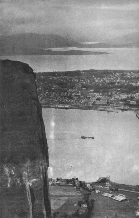 Он занял часть большого острова. Белый, высоко поднятый над проливом мост, под средней аркой которого могут свободно проходить океанские корабли, связывает город с материком. За проливом — снегоголовый хребет. А сам город удивительно зеленый, с очень ярко окрашенными зданиями.