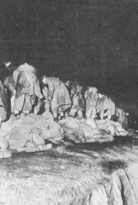 Вечная борьба с морем… Снимок сделан ночью, когда жители прибрежного селения лихорадочно заделывали брешь в плотине.