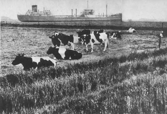 На голландской ферме можно увидеть коров, пасущихся на бывшем морском дне. Корабль скользит по каналу выше их пастбища.