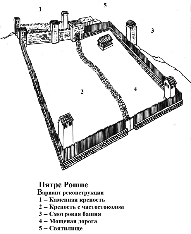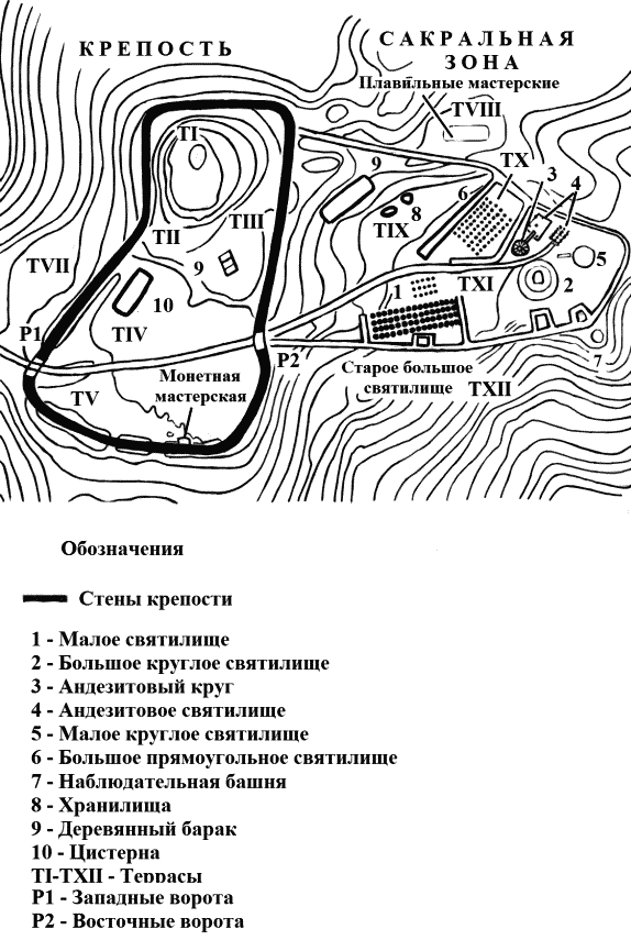 Столица Дакии Сармизегетуза Регия располагалась на холме Грэдиште-Мунчелулуй высотой 1200 метров над уровнем моря (см. схему). Подход с севера по реке Апа-Грэдиште прикрывали крепости-близнецы Костешти и Блидару, с запада – крепость Пятре Рошие (Красная скала), с юга – Банита, с востока – Капилна, а также еще несколько более мелких крепостей и наблюдательных башен. Поблизости от Сармизегетузы находился город-крепость Фетеле-Альбе, расположенный на пяти основных террасах и нескольких более мелких (всего около тридцати).