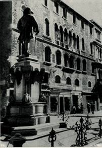 По другую сторону моста расположена оживленная площадь кампо Сан Бартоломео. На ней стоит памятник Карло Гольдони. Он сооружен в 1883 году скульптором Антонио даль Дзотто. Добрый улыбающийся «папа» Гольдони, создатель 120 комедий, рисующих жизнь Венеции XVIII века, которую он так хорошо знал и постоянно изучал, бродя по городу, слушая и запоминая меткие слова и остроумные выражения народной мудрости… Как прежде, так и ныне его любит и почитает Венеция.