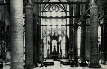 Грандиозный кирпичный фасад соответствует внутренней трехчастной конструкции здания: высокая средняя часть и более низкие боковые. Над входом зияет огромное круглое окно, по сторонам от него — еще два меньшего диаметра. Эту могучую стену венчают изящный карниз и прихотливые ажурные башенки с остроконечным завершением — неотъемлемый элемент готического декора.