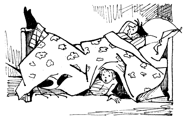 Они искали все время, пока Великий Завистник, зевая, шел домой из аптеки «Голубые Шары». Он задремал в лифте — так сильно подействовал на него микстура. Полусонный, еле передвигая ноги, он вошел в свою комнату, и только тогда Таня с Петькой перестали искать ремешок. Полумертвые от страха, они притаились под кроватью, на которую он рухнул, едва стащив с себя пиджак и брюки.