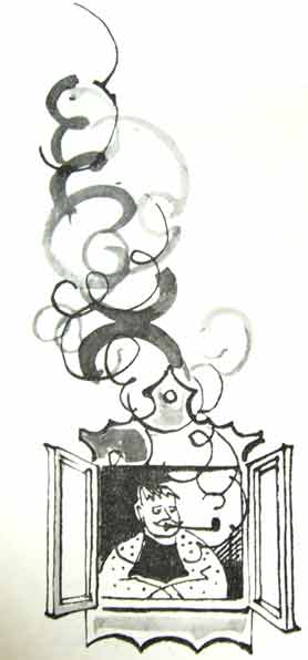 Старый Мастер, набив в трубку табаку, умял его коротким желтым пальцем, закурил и стал думать. Пуф-пуф! Большие важные кольца дыма стали медленно подниматься в воздух, а за ними — пуф-пуф — покатились мохнатые голубые клубочки. Это значило, что вопрос сложный. Когда Старый Мастер обдумывал несложный вопрос, он просто пускал дым из ноздрей.