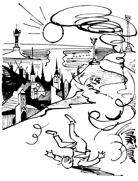 Небезопасно было идти напрямик через город. Петя решил обогнуть крепостные стены и действительно не встретил почти никого; Старая женщина, на которой было много юбок, выглядывающих лесенкой одна над другой, гнала осла по пыльной дороге. Непохоже было, что она умеет летать. Скорее Петька мог бы сказать это об осле, который весело поигрывал ушами. Двое мальчишек гоняли мяч под крепостной стеной так лениво, что тот, который посылал мяч, успел бы, кажется, вздремнуть, пока мяч возвращался обратно. Короче говоря, у всех без исключения, кого он встретил, был сонный, скучающий и одновременно чем-то озабоченный вид. Об этих летающих людях можно было сказать, что даже и на земле они стоят не очень-то твердо. Одеты они были старомодно, хотя и не очень. Но вот из-за линии черепичных крыш показался летевший по воздуху толстяк с портфелем, в белой рубашке и в сиреневом модном костюме. Но и у толстяка, может быть, потому, что он летел по важному делу, был озабоченный и даже несколько испуганный вид.