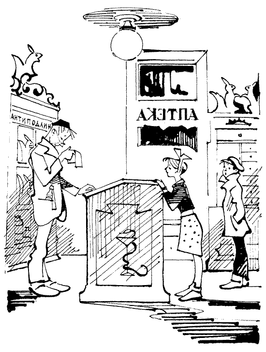 Вот так аптека! На полочках стояли бутылки — большие, маленькие и самые маленькие, в которых едва могла поместиться слеза. Фарфоровые белочки, присев на задние лапки, притаились между ними. Это тоже были бутылки, но для самых редких лекарств. На матовом стекле вдоль прилавка вспыхивала и гасла надпись: «Антиподлин». Пока Таня раздумывала, что значит это странное слово, дверь открылась, и толстый мальчик, пугливо оглядываясь, вошел в аптеку. Это был Петька, тот самый, с которым она познакомилась в пионерском лагере в прошлом году. Но Петька был не похож на себя, вот в чем дело! Воротник его курточки был поднят, а кепка надвинута до самых ушей.