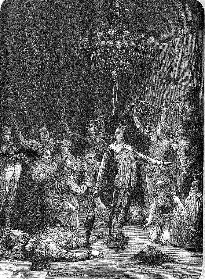 В эту минуту вошла испуганная королева и, бросившись в ноги к шуту, называла его своим мстителем. Бриам поднял её, встал около и, взмахнув окровавленным топором, пригласил всех придворных присягнуть своей законной королеве.