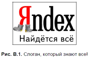 В год, когда была образована компания "Яндекс", на канале НТВ прошла рекламная компания поисковой системы, во время которой был впервые озвучен слоган "Найдется все!" (рис. В.1). Сегодня этот лозунг знает каждый, кто использует Яндекс для поиска информации. В канун 2007 года на домашней странице портала выводилось сообщение — "Поиск по 1 372 783 513 вебстраницам". Это, конечно, далеко не весь Рунет, но его значительная часть.