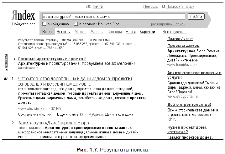 Точно не известно, являлся ли Яндекс первопроходцем в создании параллельного поиска или нет, но такой поиск появился на нем одним из первых. Суть его заключается в том, что, помимо основного поиска среди документов, ведется поиск среди специализированных источников, дополняющих ответ на запрос. В качестве главных дополнительных источников на Яндексе приняли данные по картинкам, товарам и услугам. И если в этих источниках находится хотя бы один ответ на запрос, он будет показан рядом со ссылками на документы. Ответы других источников выводятся только в том случае, если они будут признаны достаточно релевантными. В таком режиме выводятся результаты поиска среди новостей, энциклопедических и словарных статей, каталога. Результаты поиска среди карт и прогнозов погоды выводятся только в том случае, если в запросе в явном виде заключен соответствующий запрос (рис. 1.8).